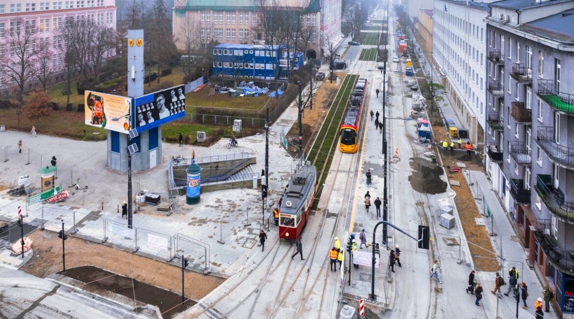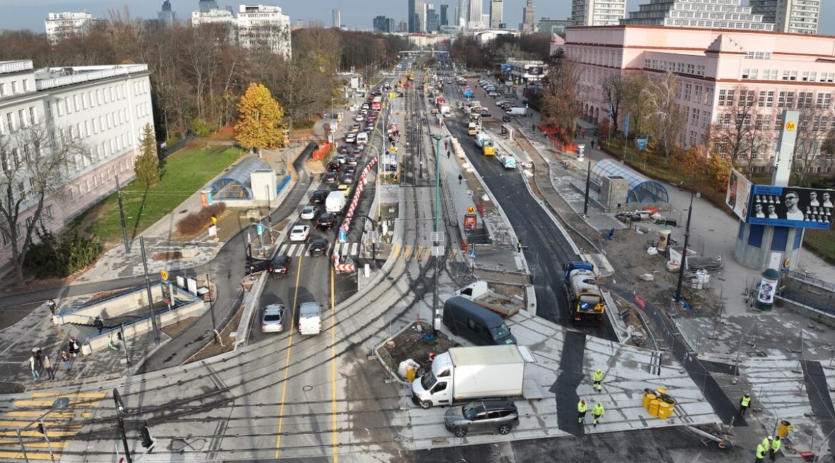 Przy SGH kończy się skomplikowana budowa zachodniej części węzła rozjazdowego, który powstaje jako część nowej trasy tramwajowej na ul. Rakowieckiej, między al. Niepodległości a Puławską. Od nowego roku szkolnego tramwaje wrócą na al. Niepodległości, Rakowiecką i Wołoską, a ruch kołowy na al. Niepodległości zostanie przełożony na druga jezdnię.
