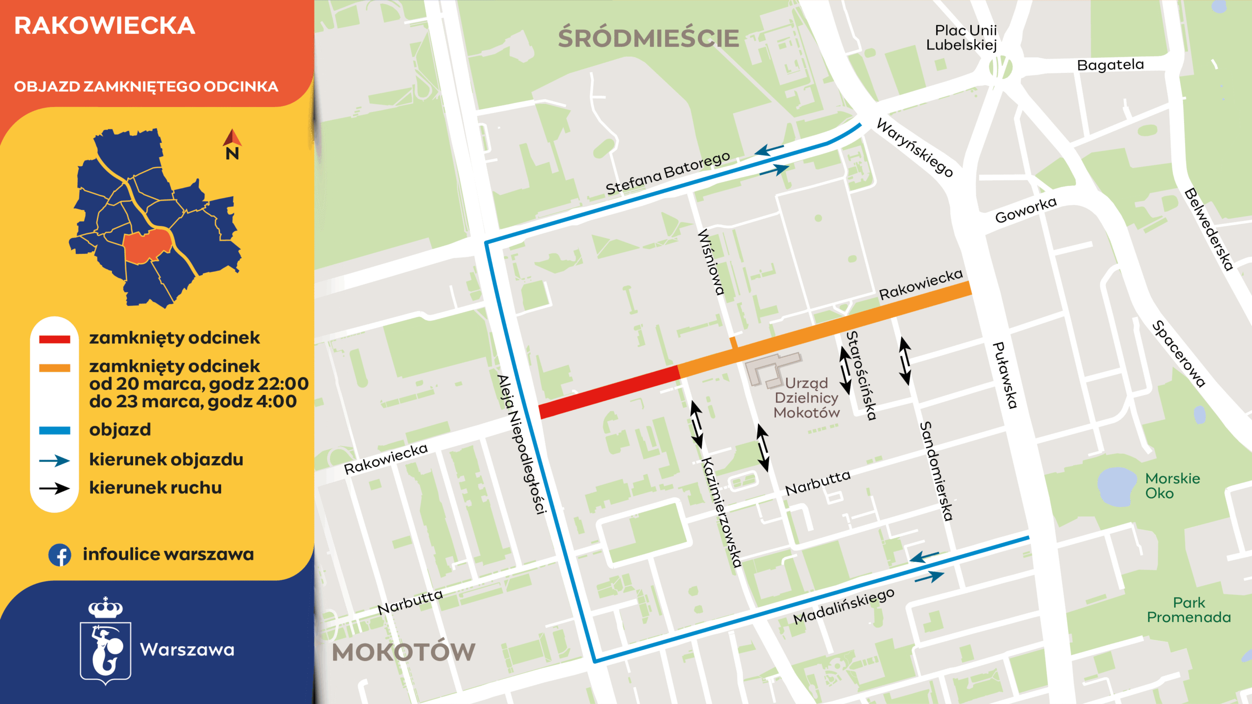 • Z ulic: Kazimierzowskiej, Wiśniowej, Starościńskiej i Sandomierskiej nie będzie wyjazdu na Rakowiecką.